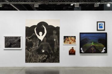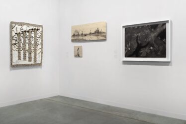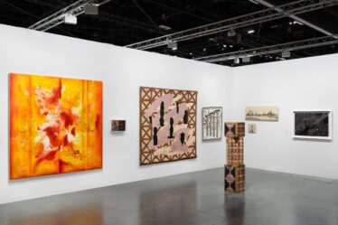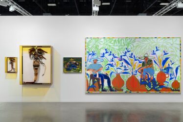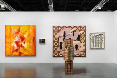 Sanford Biggers plays with scale as a portal to time and tradition. The textile En Passant sprawls across the booth with a ceremonial presence, while Tower, a vertical sculpture, condenses cultural weight into a compact axis. Together, they articulate how cosmology can be both woven and forged—expanded or concentrated.