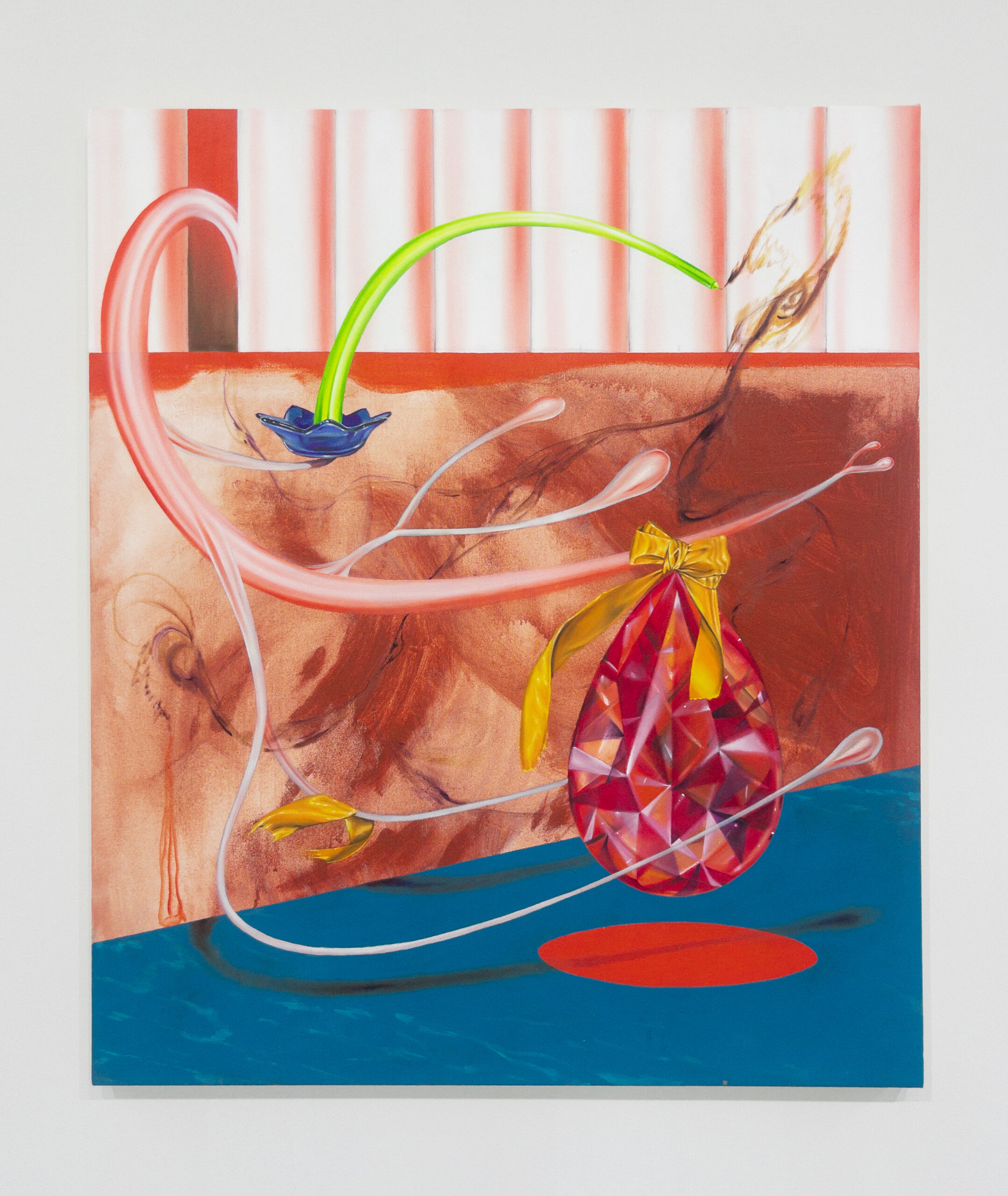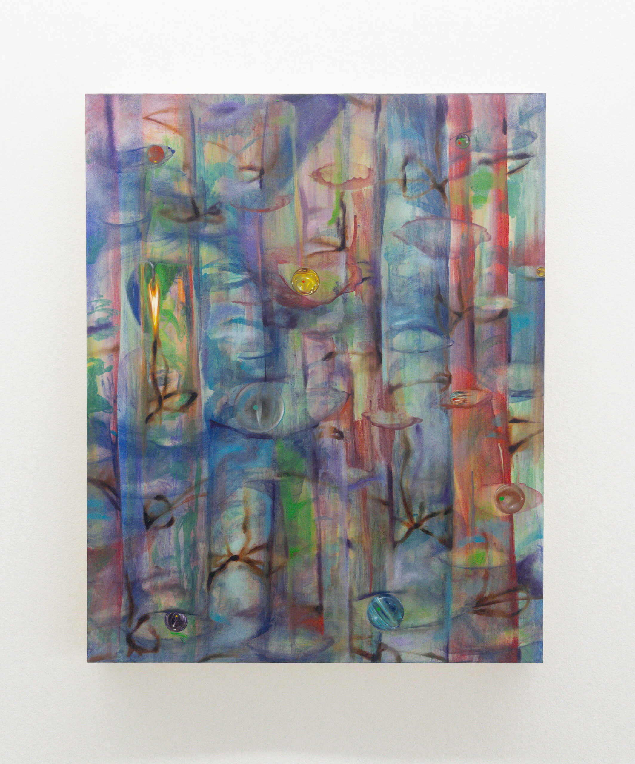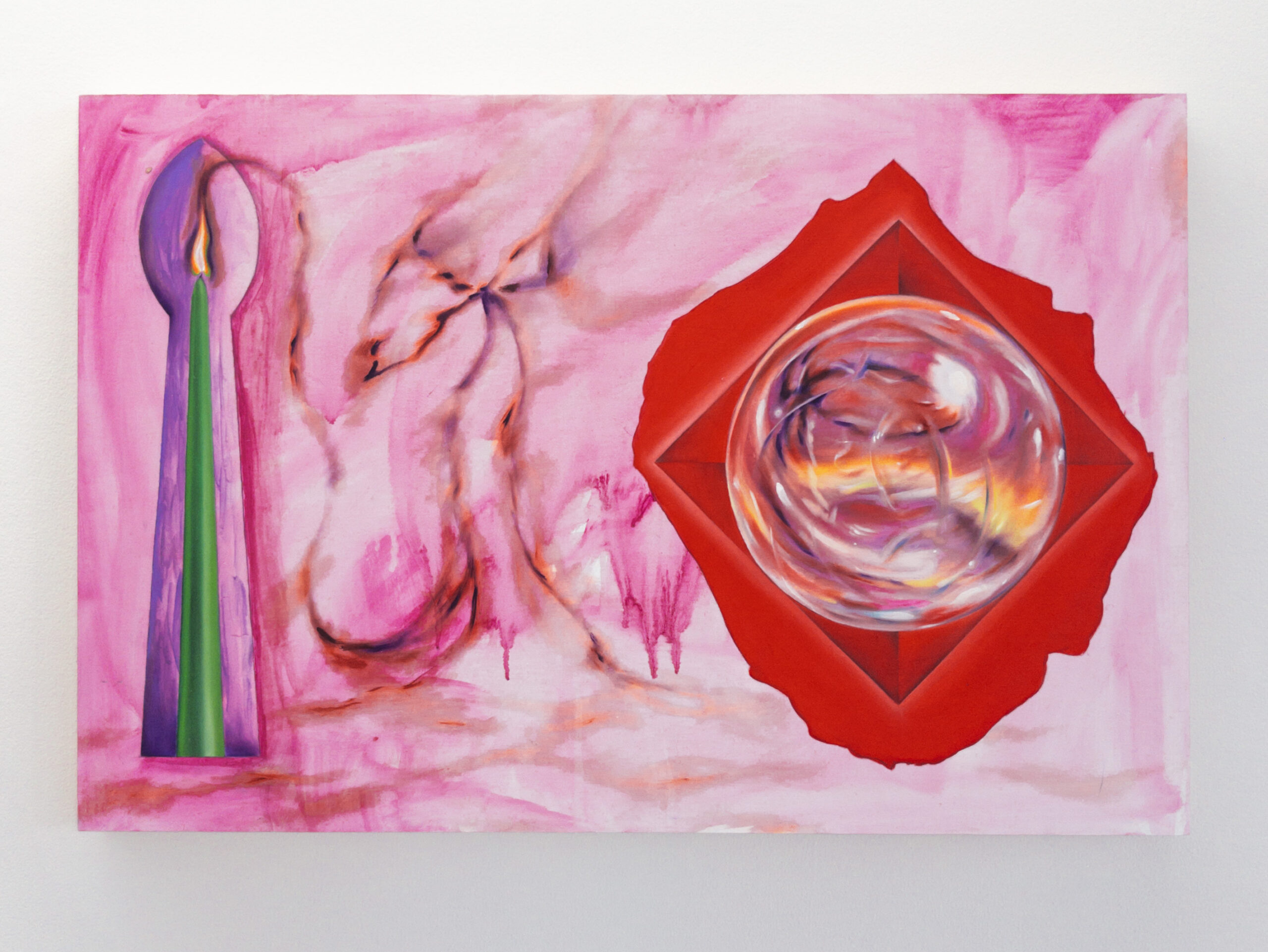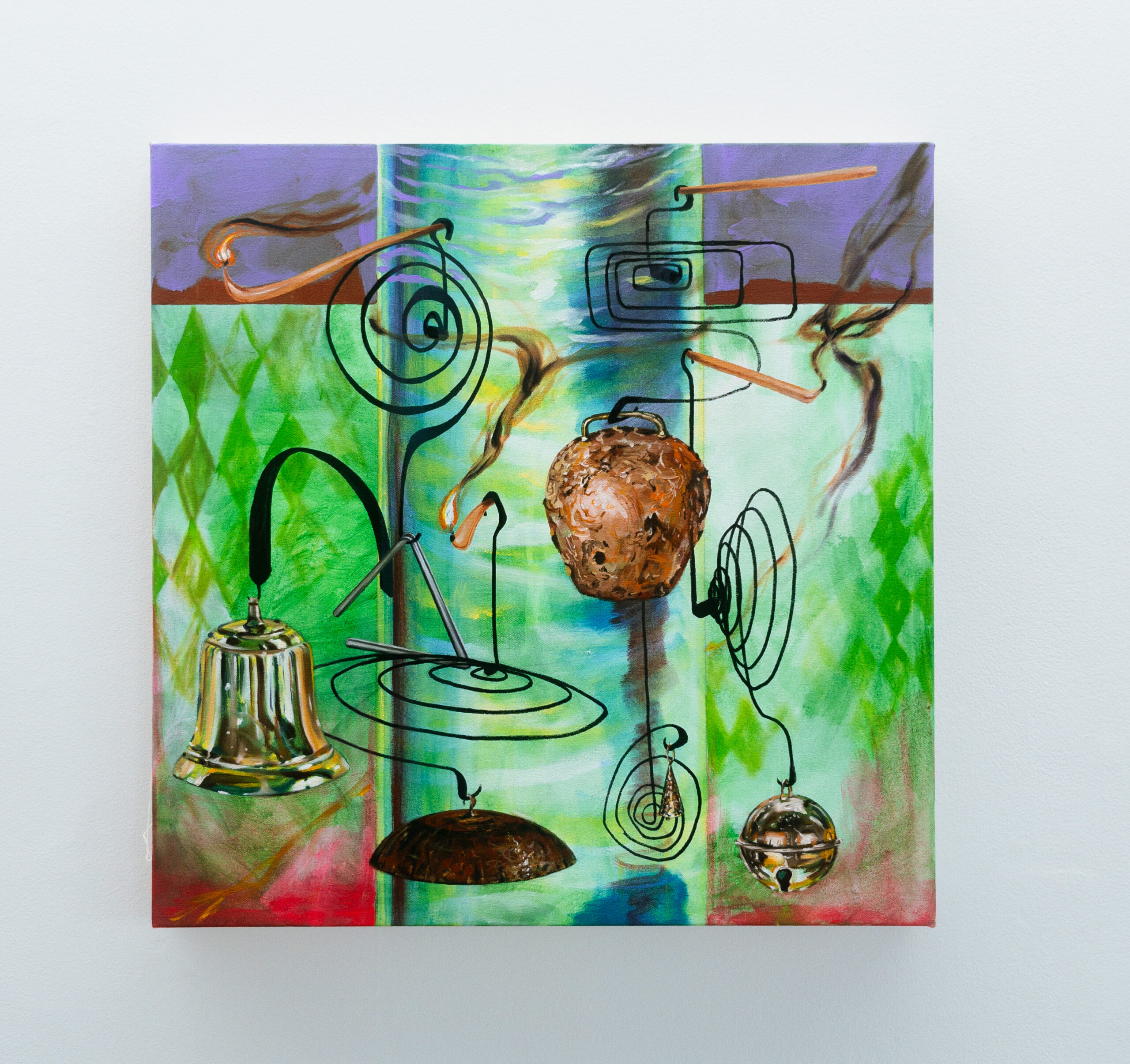 Other symbols recur: prismatic gemstones, bow-tied ribbons, and marbles dangle from branches and trunks, and flames illuminate and melt their surroundings. The encounter in the woods reminded Venturini, he says, of alternative ways of living. He developed a visual lexicon using Polish folk craft and mythology, exploring the possibility of utilizing these icons in his own life, for his own dreams. The woods lure cruisers with bells. “Tree of Lineage” (2025) depicts an abstracted pajak, a Polish chandelier—an enmarbled eye, a diamond, and a red bow are its charms.