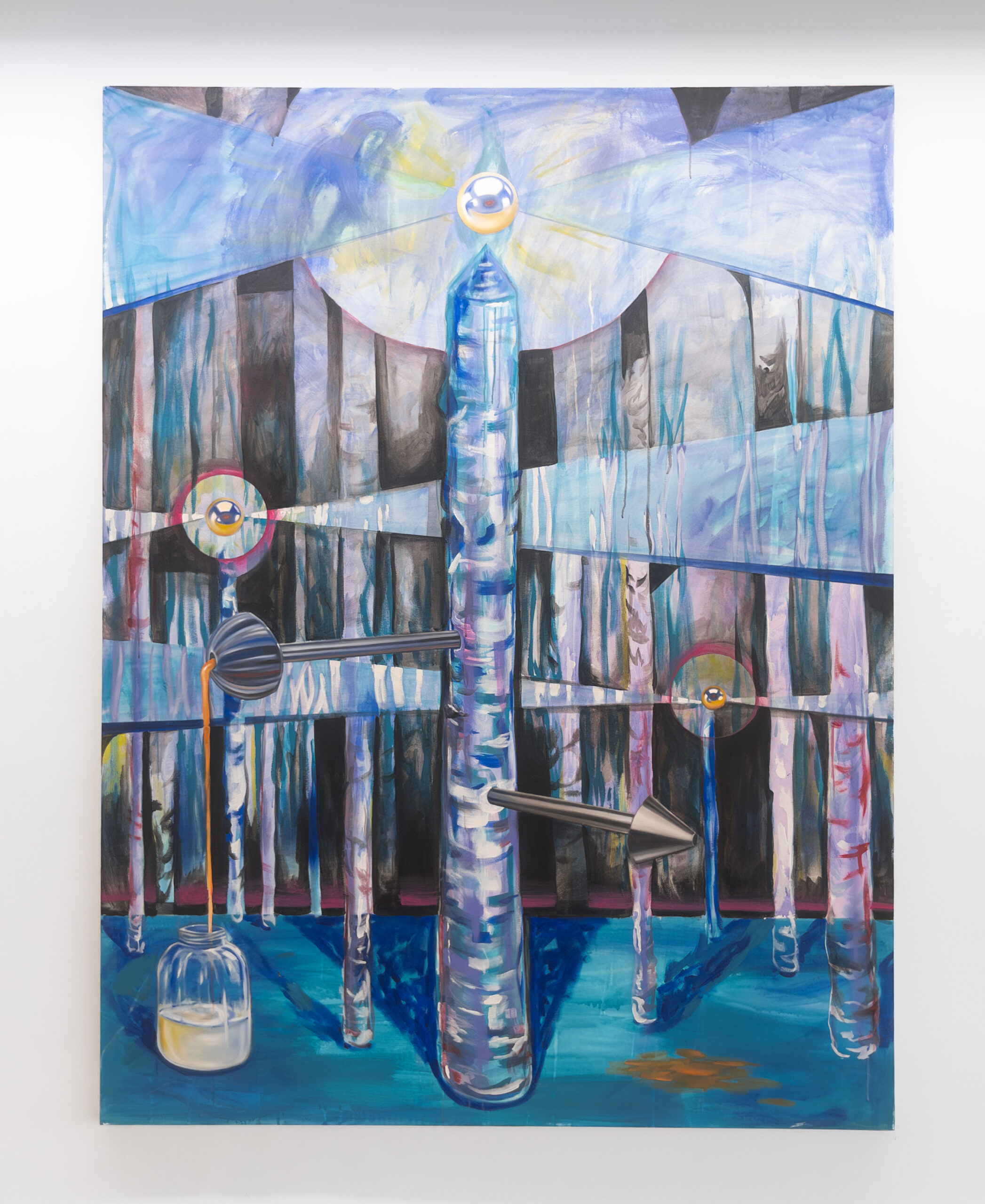 Venturini became interested in literally and figuratively queering that landscape. In works like “Guiders Through the Crowd” (2025), the forest’s birch trees glow and shine like beacons; tapped with spiles and leaking amber, they’re anthropomorphized. The trees in “Sneak Peeks” (2025), rendered in a kaleidoscopic palette of blue-greens and reds, don’t just spill liquid but observe with wide-open eyes, steady and easily camouflaged. Venturini’s forest watches the cruisers, joins them, protects them.
