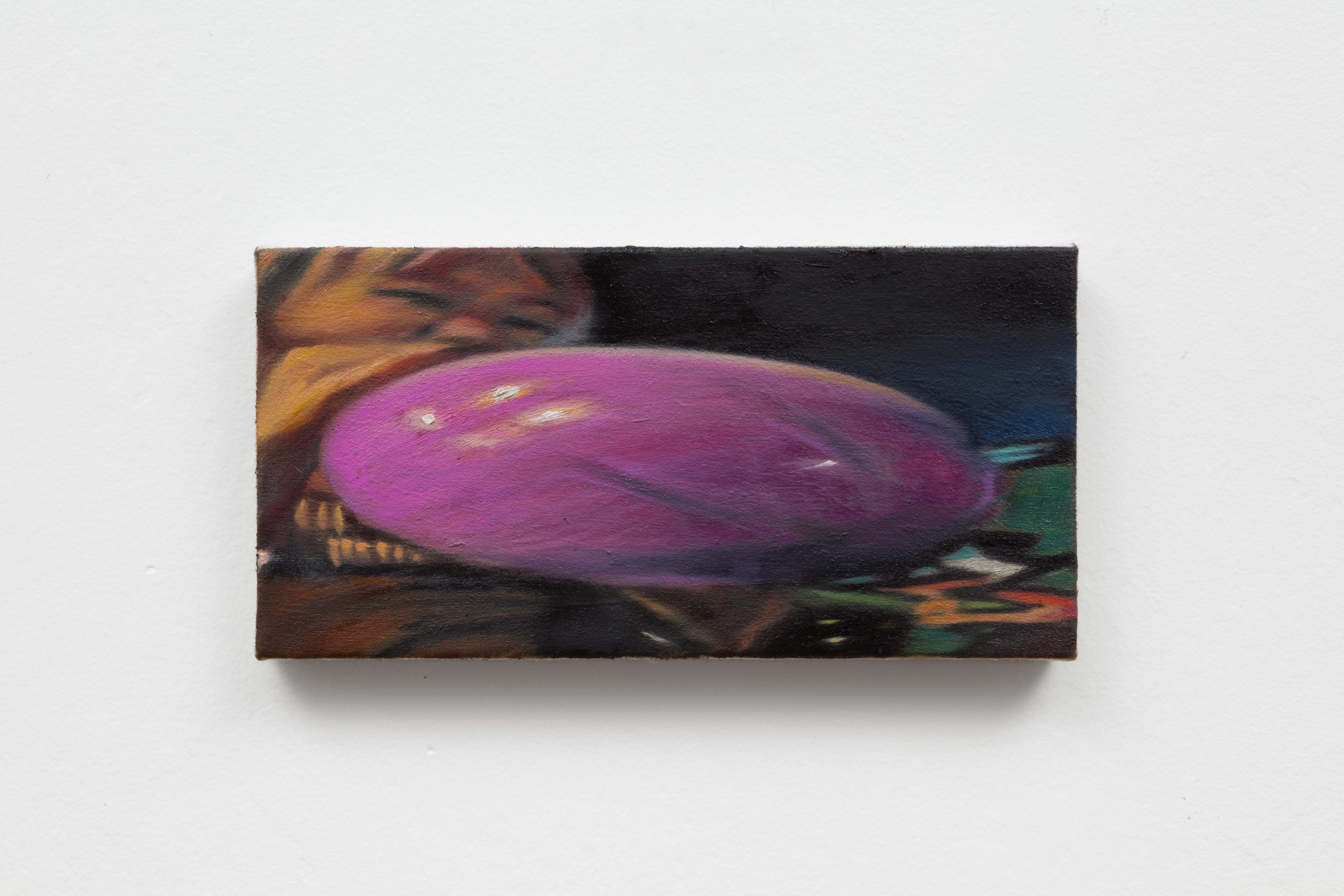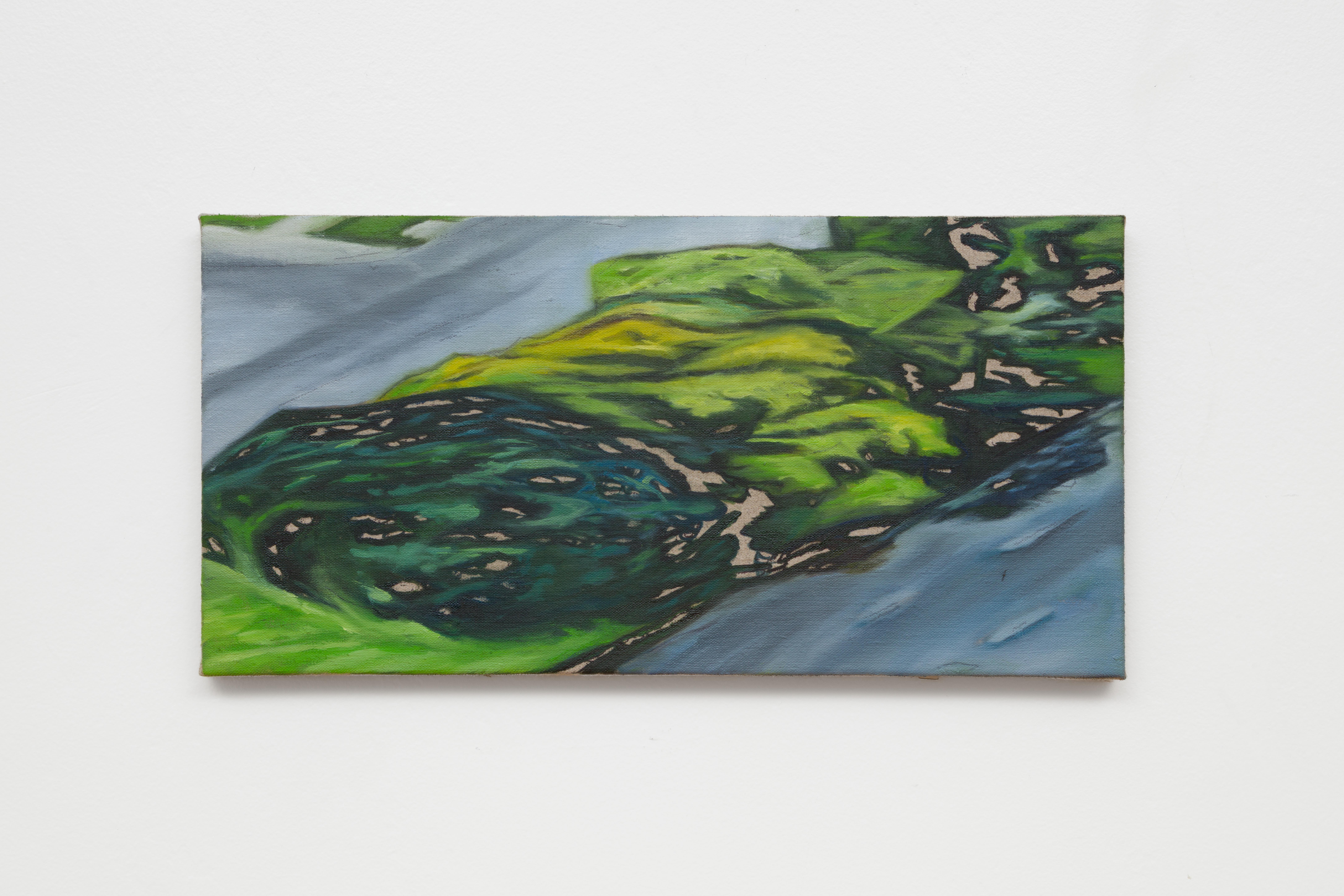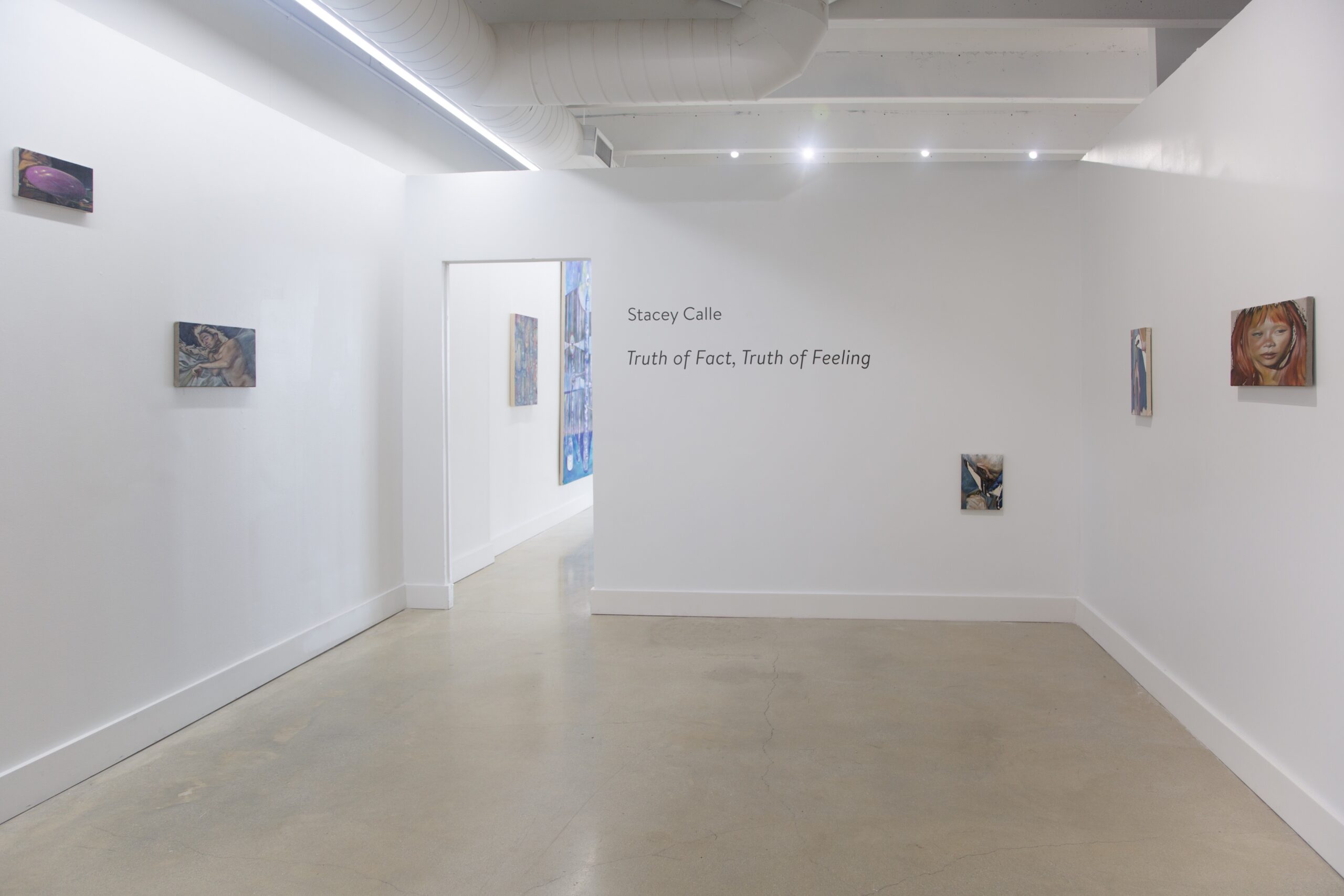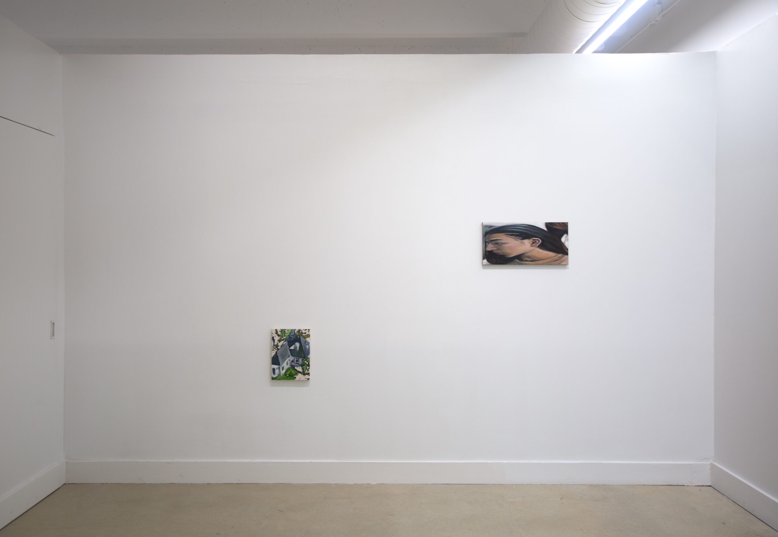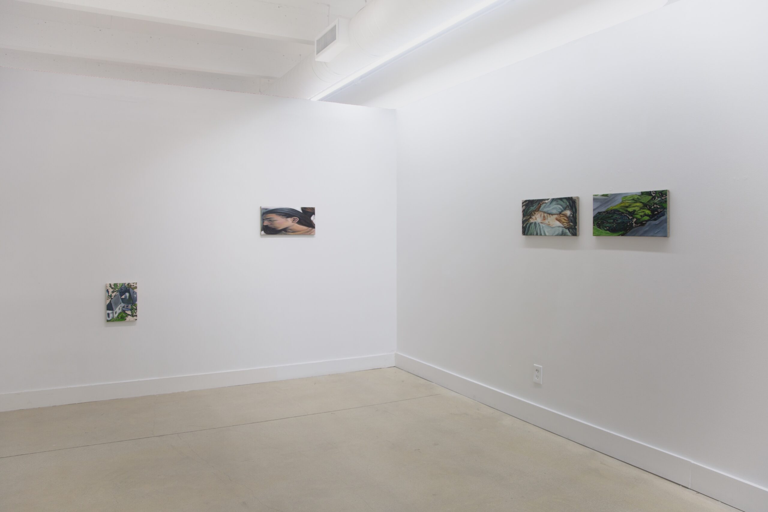 Over half the paintings in Truth of Fact, Truth of Feeling feature people: a redheaded friend inflates a purple balloon; another peers downward, hair swept behind their ear. Stacey Calle worked from photographs for these images, though they were not always personal; our phone’s photo album, he states, “has become a notebook…a prosthetic memory. Photos of daily moments mix with photos of parking lots, receipts, recipes.” There’s a delicately distorted, fish-eye quality in even the most photorealistic of his paintings—hyper-real and altered, not unlike memories. “0:00 (1)” (2025) depicts the sky, breath-soft clouds above a hazy electric pole, the whole thing overlaid with a swath of green and purple and the scene’s corner cut out, an outline left in white. In “12:01” (2026), a grey-blue house is seen from above, the background mottled: static glitching into and out of view. They’re oneiric, particular details completely whited-out or dreamily blurred.