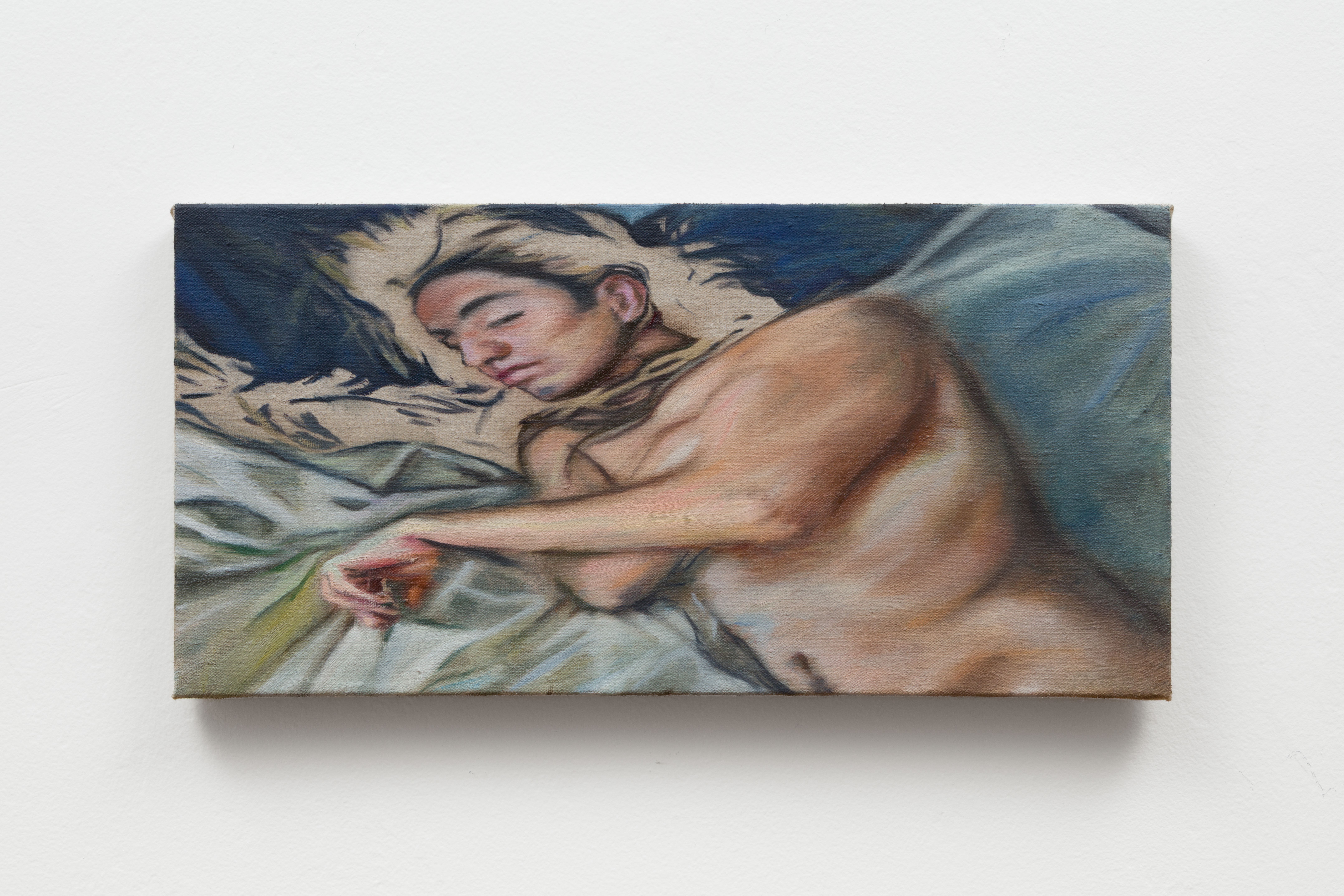 Speaking of dreams: Calle is also interested in the wakeful hallucinations of extreme tiredness, the hypnopompic state between sleep and consciousness. In “8:23” (2025), an oil-on-linen work, a gentle-faced person sleeps soundly, an arm stretched across a rumpled sheet, a beige negative space around their head. Memories, once revisited, can feel like dreams. The former most certainly happened, but the specifics are often hard to remember; with time, they transform. The latter is never as real as real life, but can feel even clearer. Sometimes, the two are mistaken for each other. Who among us hasn’t confused a dream with a memory, or woken from one that felt profoundly real, its attendant emotions stretching into the day? Appropriately, the childhood photo that Facebook resurfaced became a painting, also titled after Chiang’s story. Dreams are as factual as memories; memories are as potent as sleep.