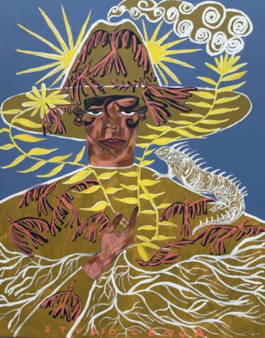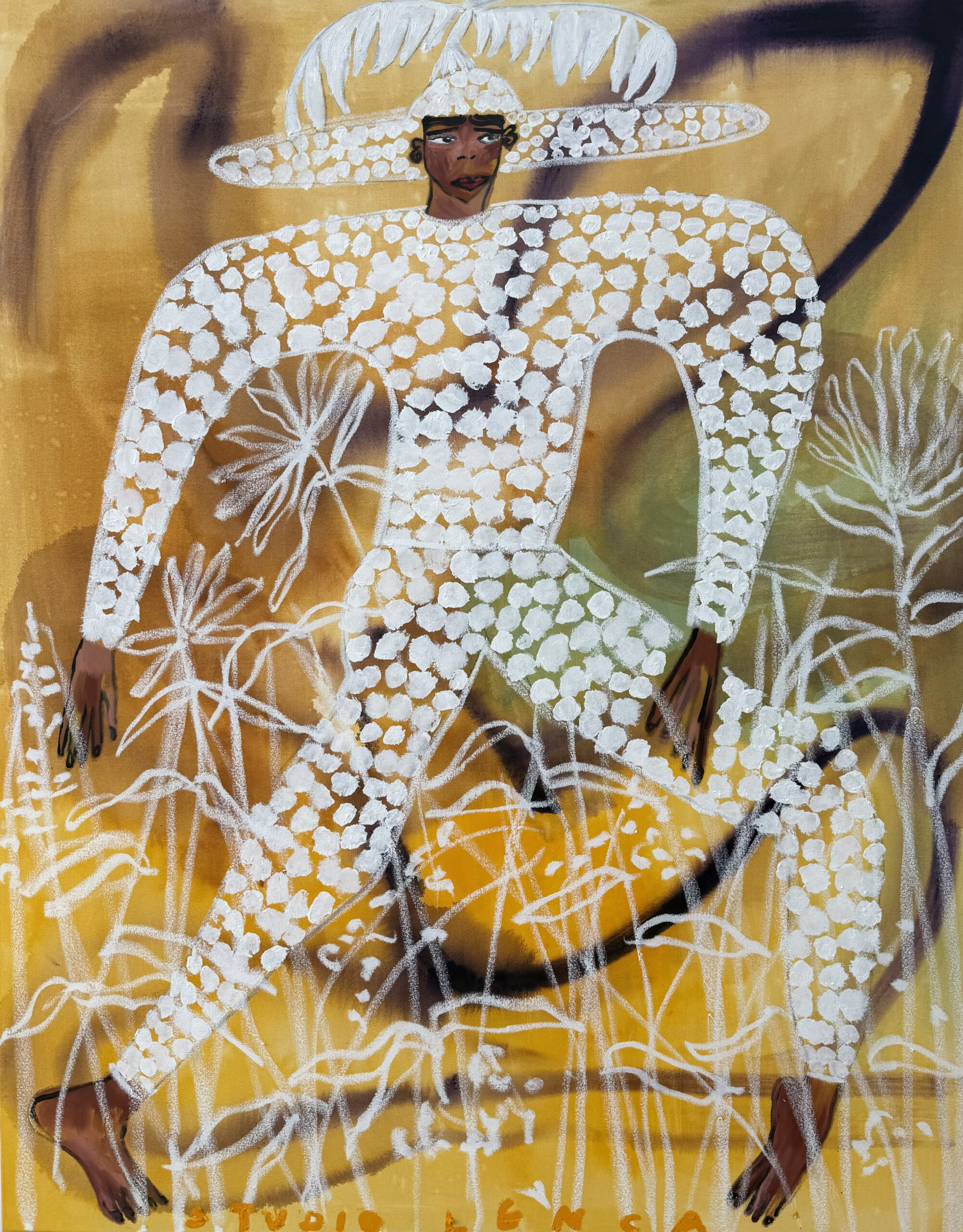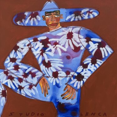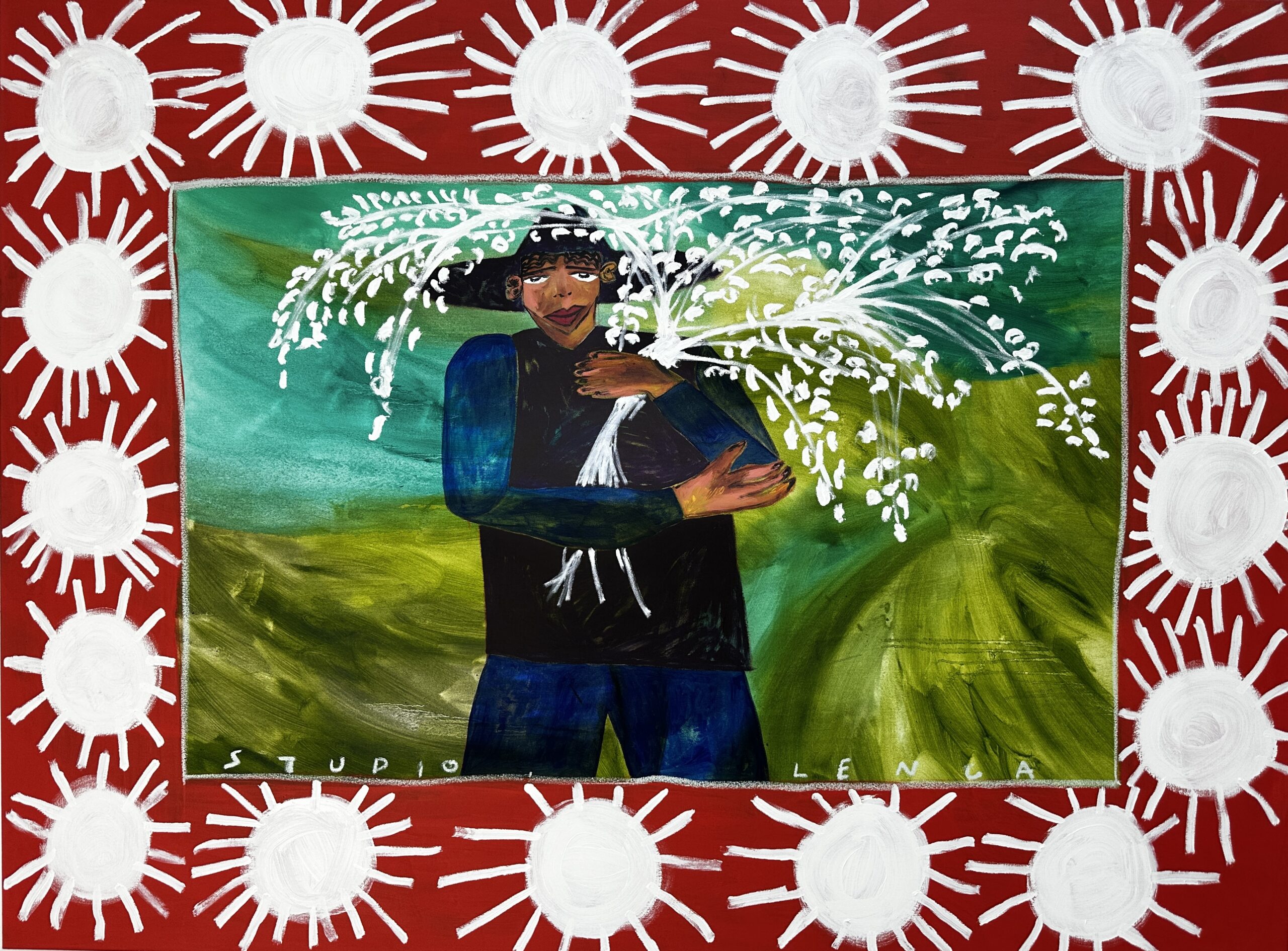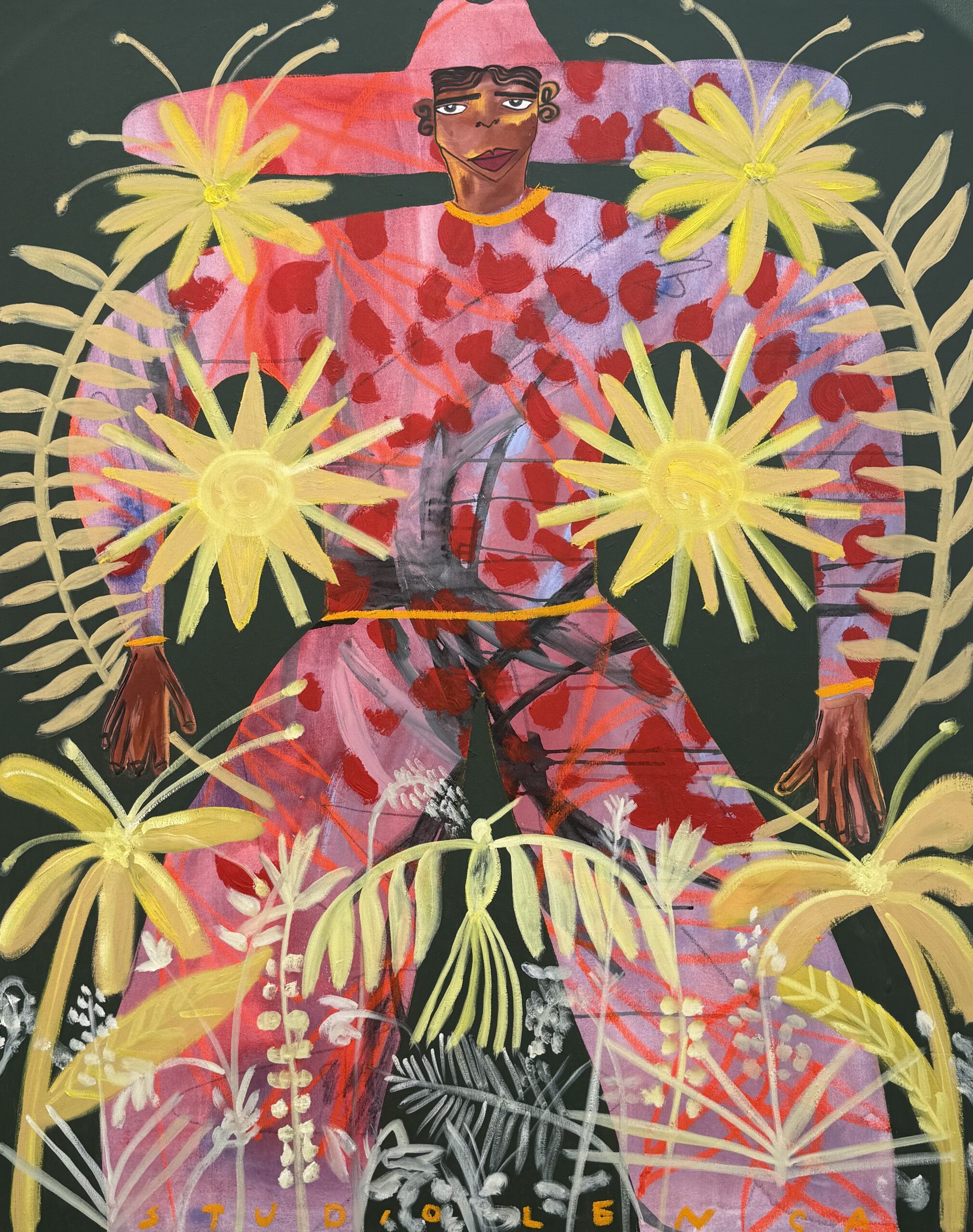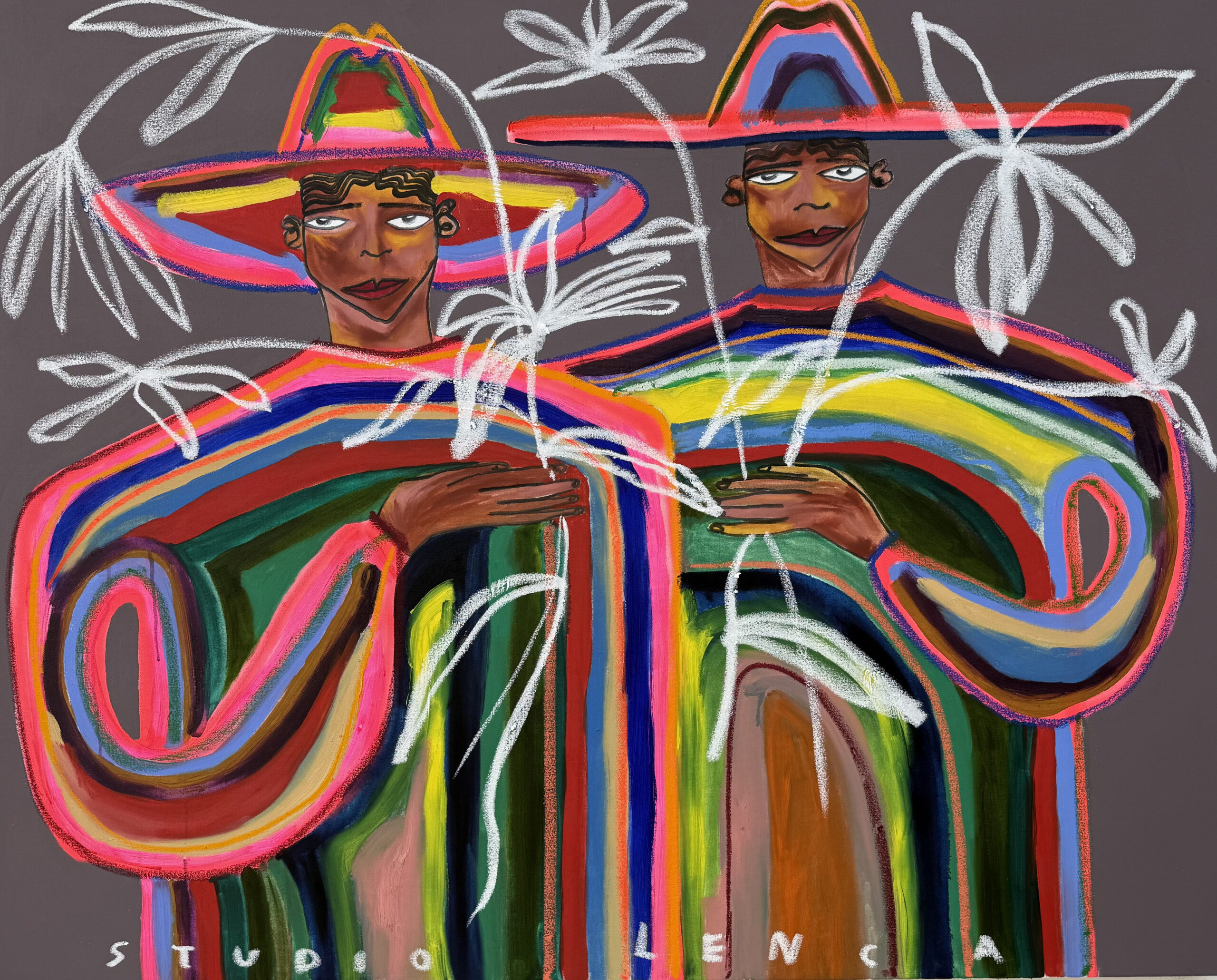 For Studio Lenca, the repeated Historiante figures act as an anchor in a fractured narrative. As a mixed Indigenous person with only fragments of family history, the artist turns to these figures, recasting them as protagonists moving through contested spaces. Repeated across the canvases, they form a chorus of presence: visible, insistent and unerasable. Their wide- brimmed hats and vibrancy refuse to be muted or overlooked. Each Historiante is witness, performer, and storyteller, carrying fragments of collective memory and offering the artist a way to imagine lineage where displacement has obscured continuity.